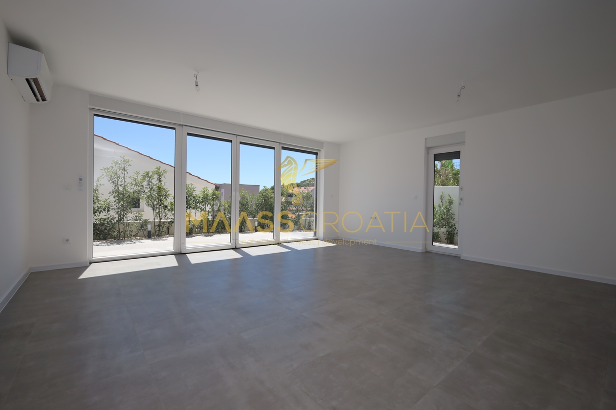 Okolica jest ozdobiona śródziemnomorską roślinnością, a parking jest wybrukowany.