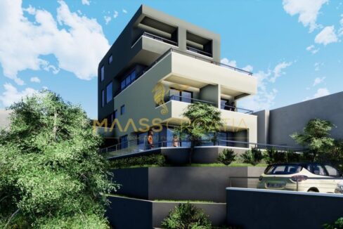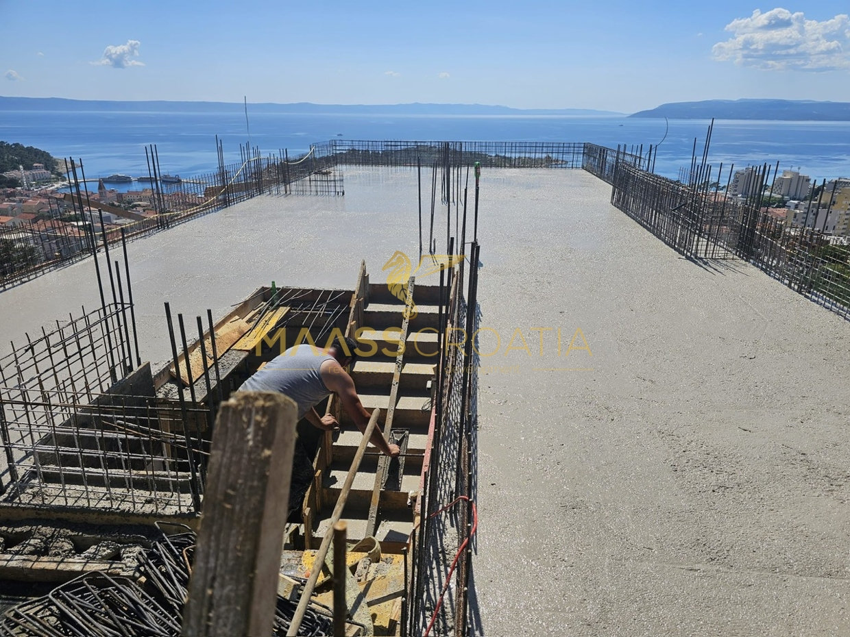 Ten nowy budynek z dwoma ustawionymi naprzemiennie domami w zabudowie bliźniaczej jest budowany na zboczu wzgórza z widokiem na morze w Makarskiej.