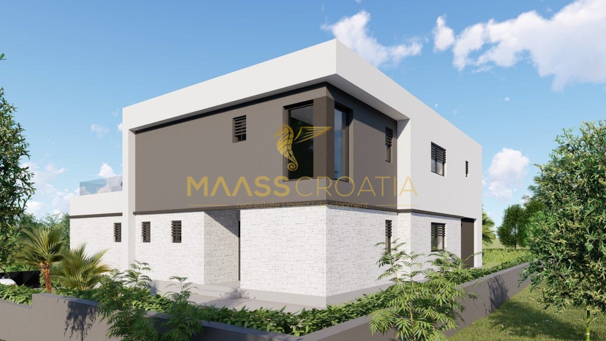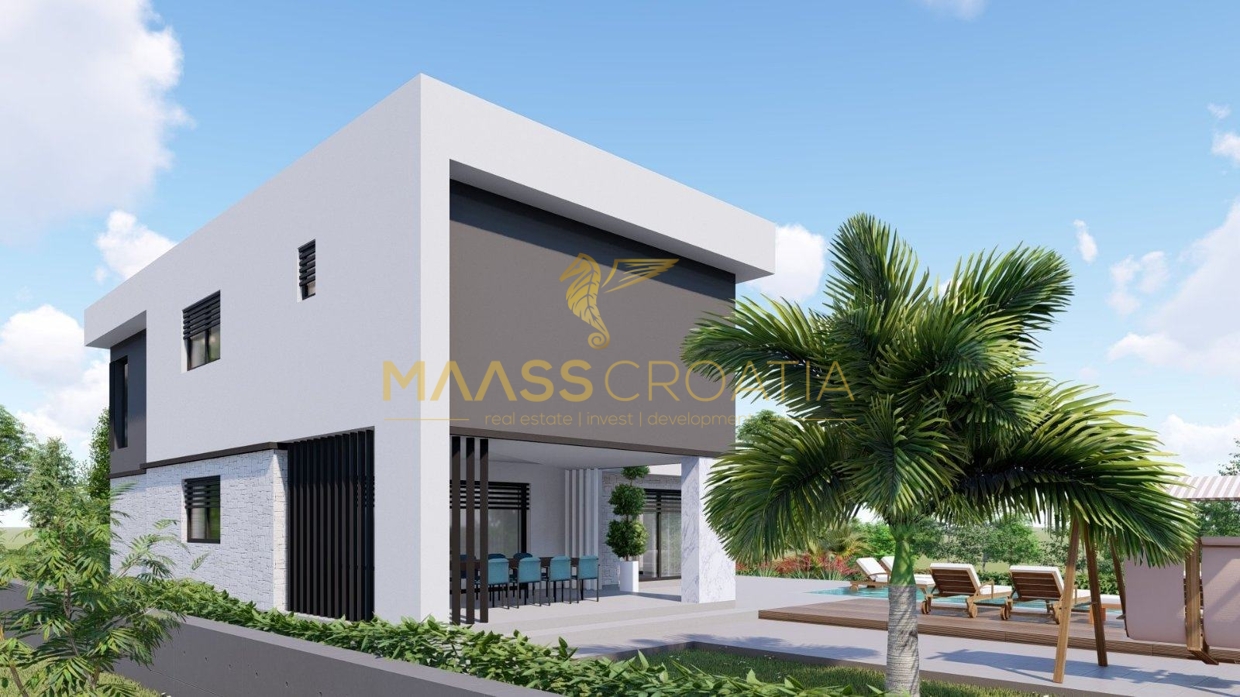 Na sprzedaż jest działka budowlana o powierzchni 260 m² z projektem luksusowej willi w budowie, położona w Marčana, w cichej okolicy otoczonej gajami oliwnymi i otwartymi gruntami rolnymi. Willa ma nowoczesny design, basen bez krawędzi, duże tarasy i panoramiczne widoki na Učkę, Velebit i Cres.