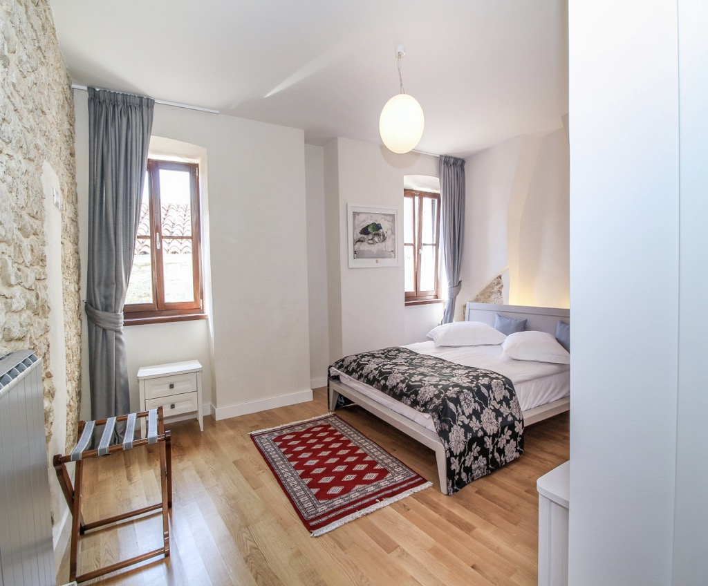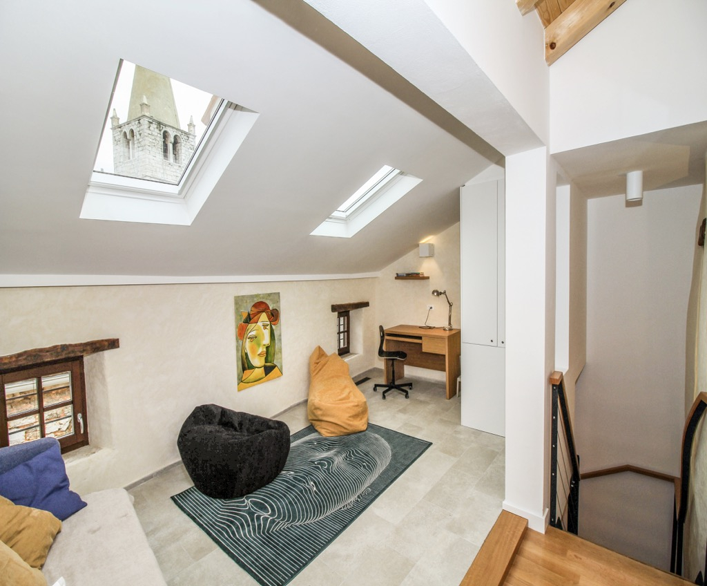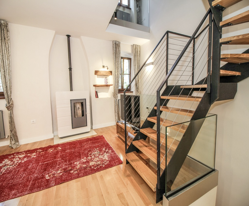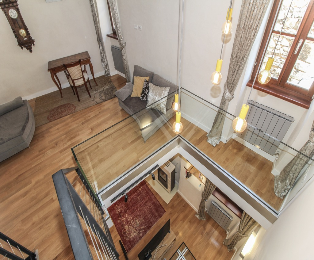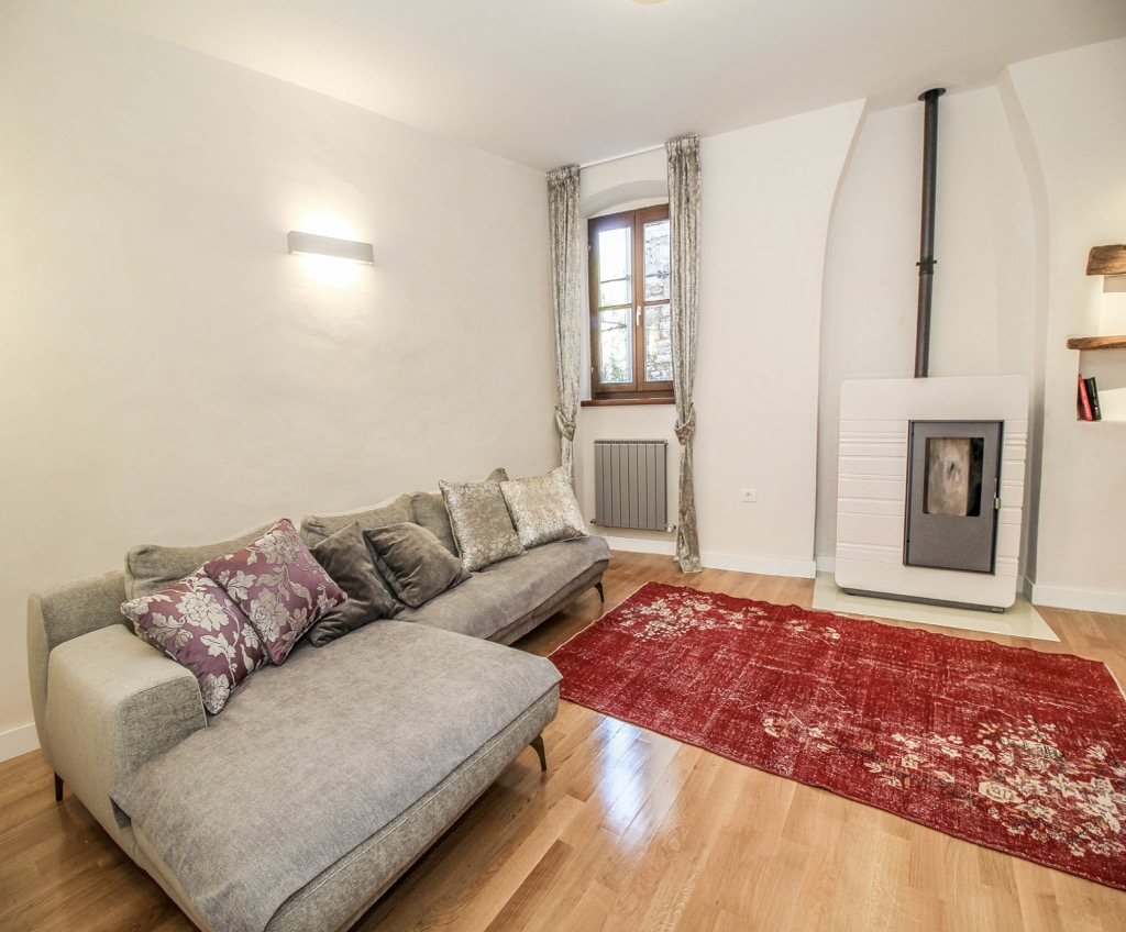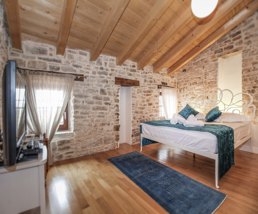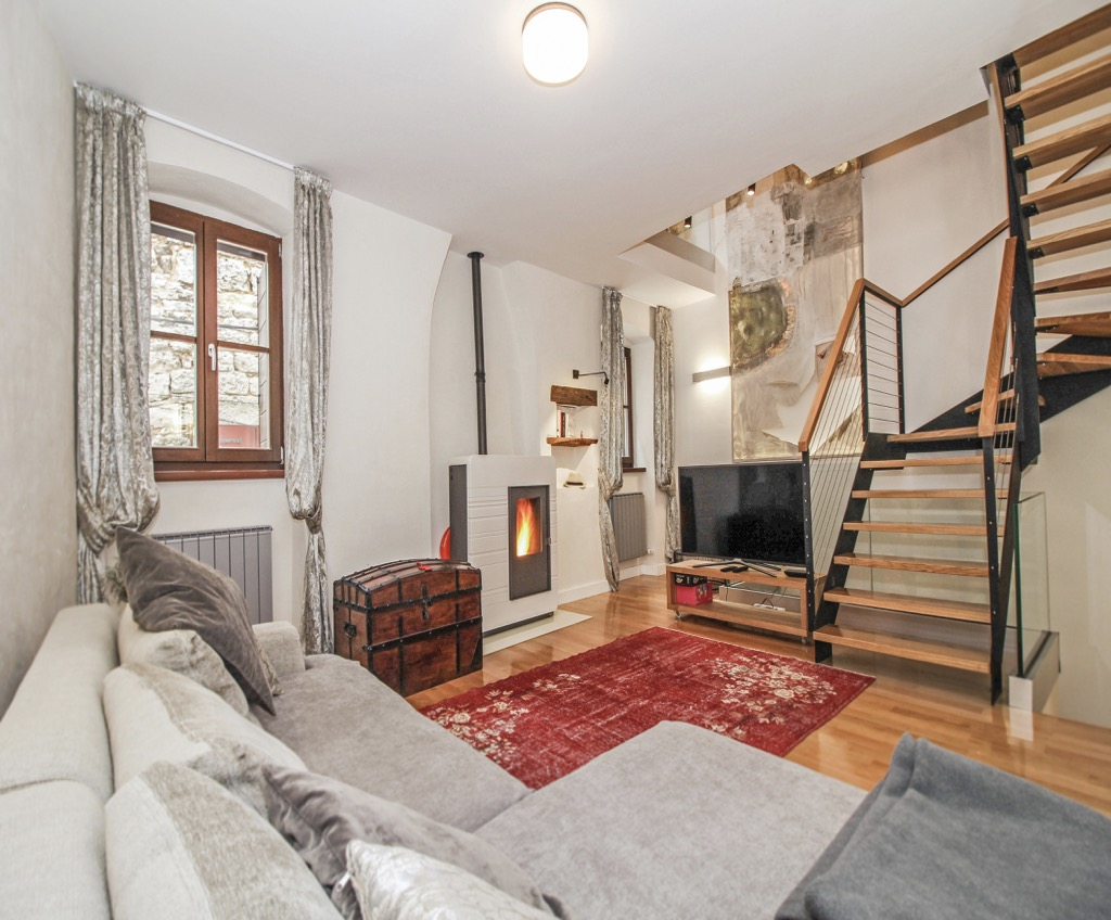 Detale takie jak kamienne ściany, drewniane podłogi i drewniane belki na dachu nadają temu domowi charakter regionu.
