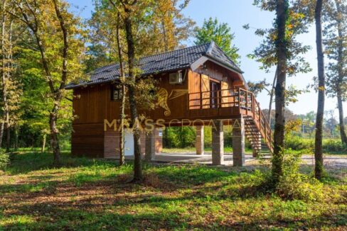 Nowo wybudowany drewniany dom bezpośrednio nad brzegiem rzeki Kupa na wsi na działce o powierzchni 2059 m².