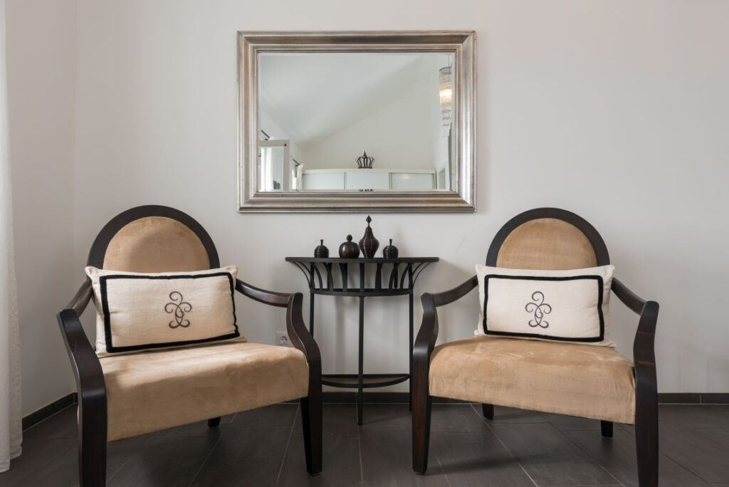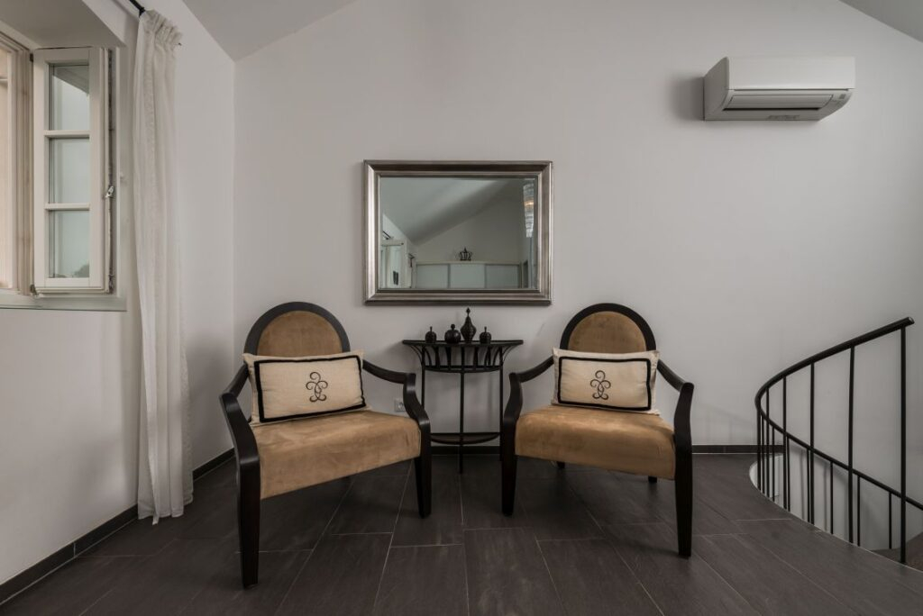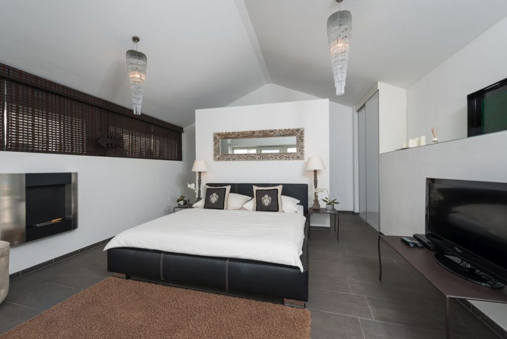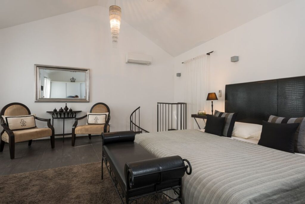 Dwa piętra są połączone z pierwszym piętrem spiralnymi schodami. Znajduje się tam przestronna główna sypialnia i piękny taras z wygodnymi krzesłami, na którym można się zrelaksować i podziwiać widok na nieruchomość, basen i bezkresne morze.