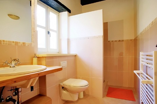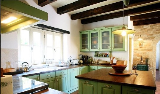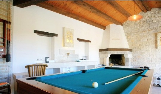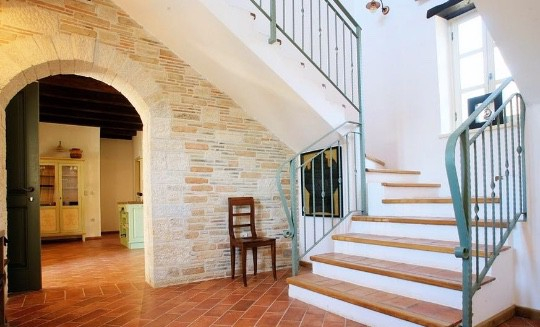 Piękny biały kamień na ścianach i masywne drewniane belki na suficie nadają temu domowi szczególny charakter i tożsamość regionu.