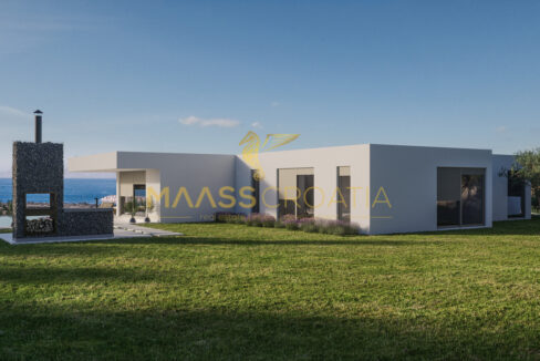 Na parterze wejście prowadzi do dwóch korytarzy, które prowadzą do części dziennej z kuchnią i jadalnią z dużymi przeszklonymi ścianami. Stąd jest dostęp do wygodnego tarasu o powierzchni 30,60 m2, na którym znajduje się basen, osadzony w atrakcyjnym wizualnie projekcie. Oczywiście z tarasu roztacza się widok na morze.