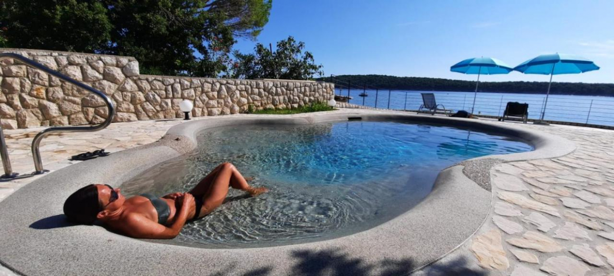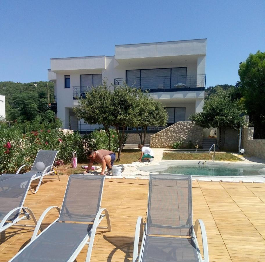 Na zewnątrz domu znajduje się taras, który można wykorzystać do relaksu lub rozrywki w sezonie letnim. Za nim znajduje się basen z widokiem na morze i pobliską wyspę, ten dom to prawdziwa gratka! Dom posiada prywatny parking z siedmioma miejscami.