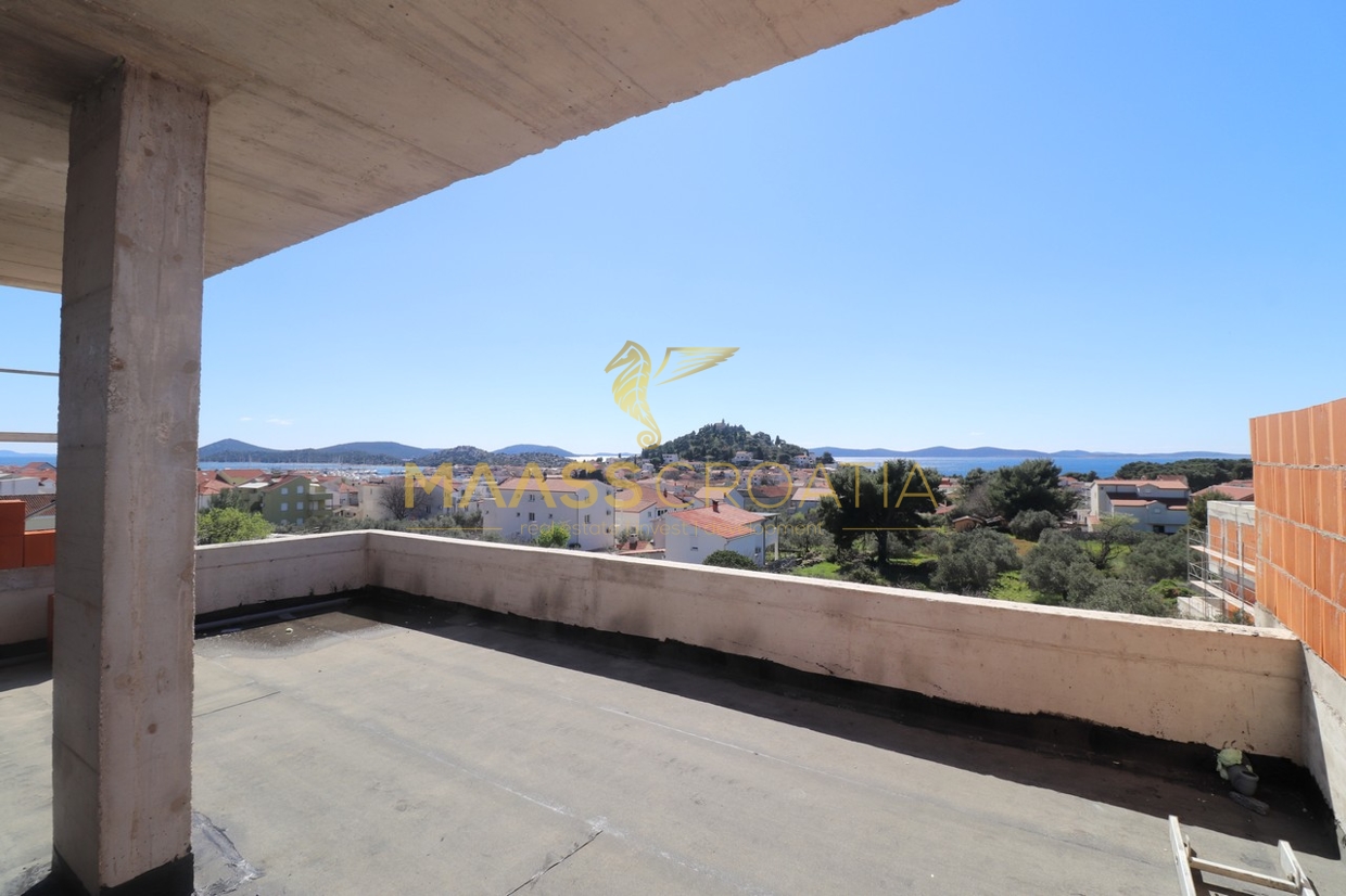 Kolejne wewnętrzne schody prowadzą na 2. piętro, gdzie znajduje się aneks kuchenny, sypialnia, łazienka i duży taras o powierzchni 53,65 m2 (z czego 40,60 m2 jest zadaszony) z panoramicznym widokiem na morze.