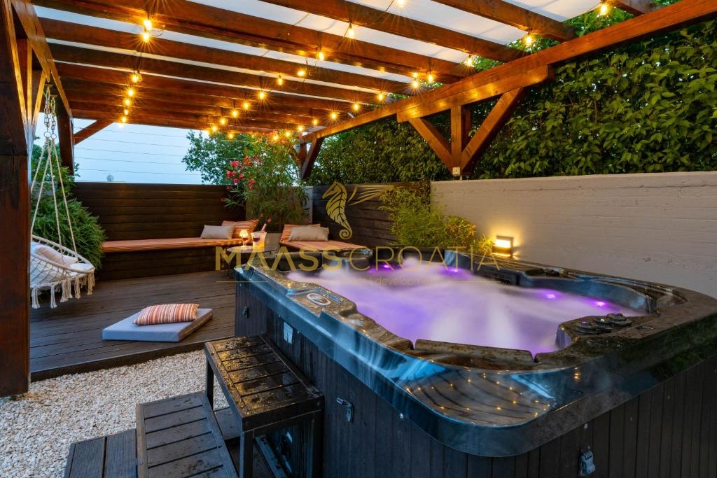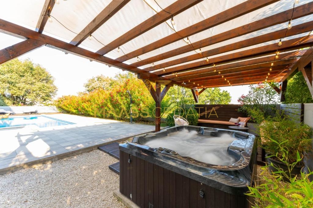 Na zewnątrz znajduje się basen o powierzchni 45 m2, miejsce do opalania i wanna z hydromasażem