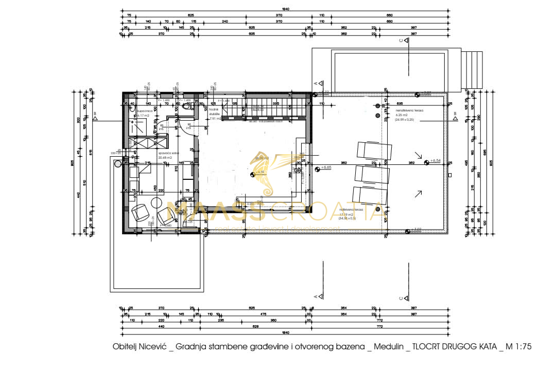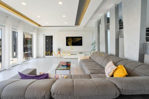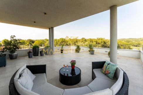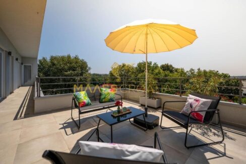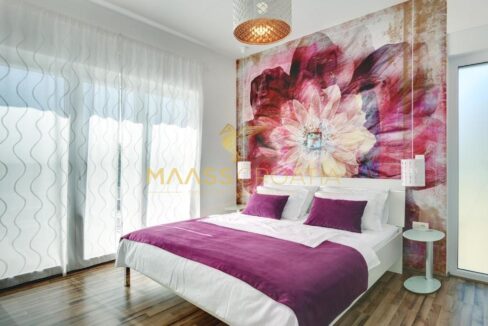 Na drugim piętrze znajduje się główna sypialnia z łazienką i kolejny przestronny salon połączony z dużym zadaszonym tarasem z pięknym widokiem na morze.