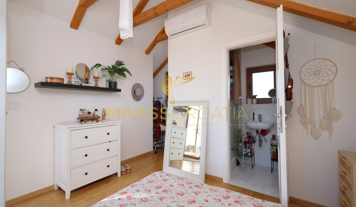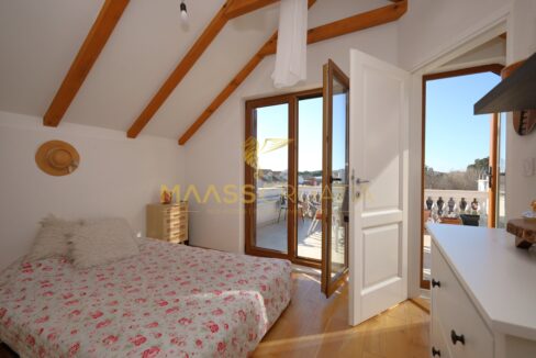 Na najwyższym piętrze znajduje się sypialnia z łazienką i dostępem do przestronnego tarasu z pięknym widokiem.