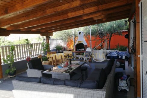 -duży, przytulny taras z zewnętrznym grillem i drewnianym zadaszeniem