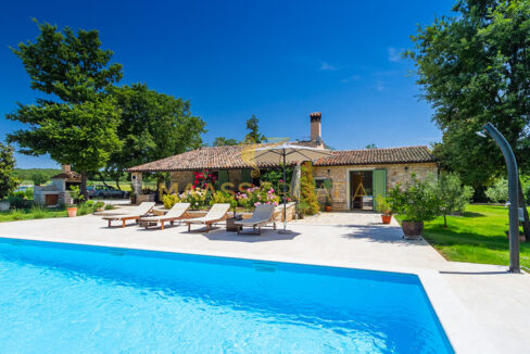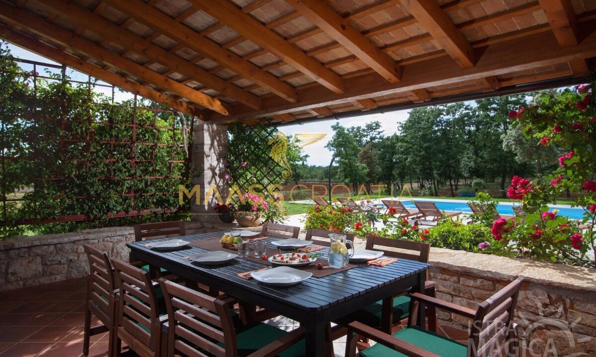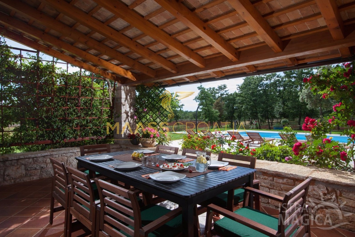 Nieruchomość składa się z jednopiętrowego kamiennego domu z zadaszonym tarasem zacienionym pergolą – idealnym do cieszenia się spokojem i widokami na okolicę.