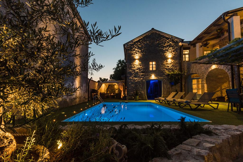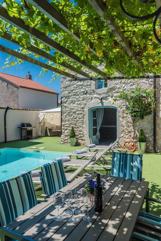 Biały kamienny klejnot z basenem i panoramicznym widokiem na morze w Novalji