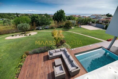 W spokojnej okolicy z pięknym widokiem na pobliskie gaje oliwne i głębokie błękitne morze, z którego widok sięga daleko do Umagu, znajduje się ta piękna wymarzona willa otoczona bajkowym ogrodem o powierzchni 5000 m2.