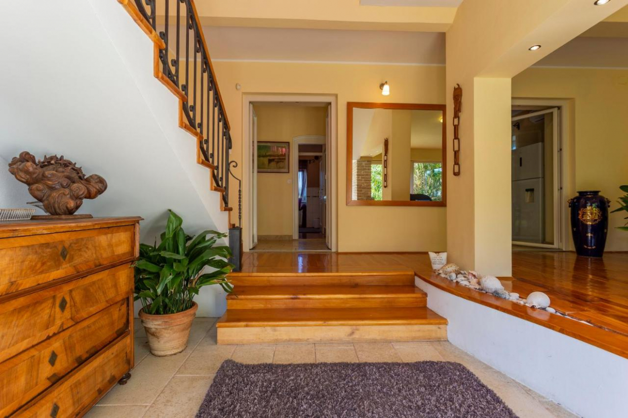 Ten dom o powierzchni 450 m2 ma 2 piętra i jest w pełni wyposażony w 5 przestronnych i w pełni funkcjonalnych sypialni, a następnie 7 łazienek, dodatkowy parking, dużą przestrzeń zewnętrzną do rozrywki (taras z kuchnią na świeżym powietrzu, plac zabaw) i jeszcze bardziej imponujący duży basen.