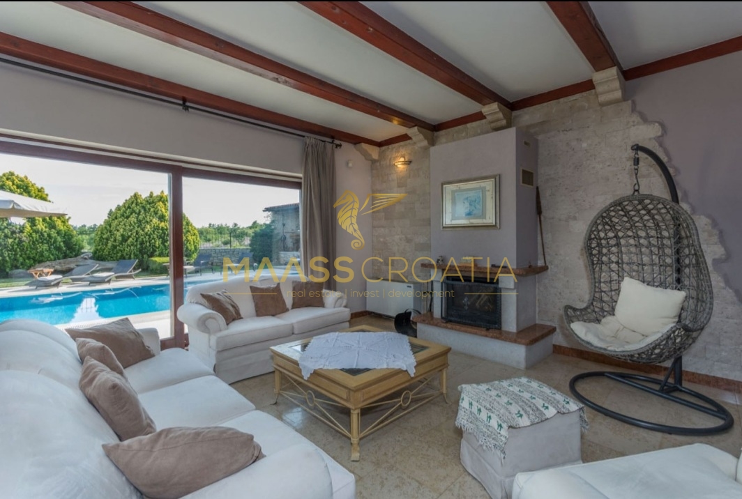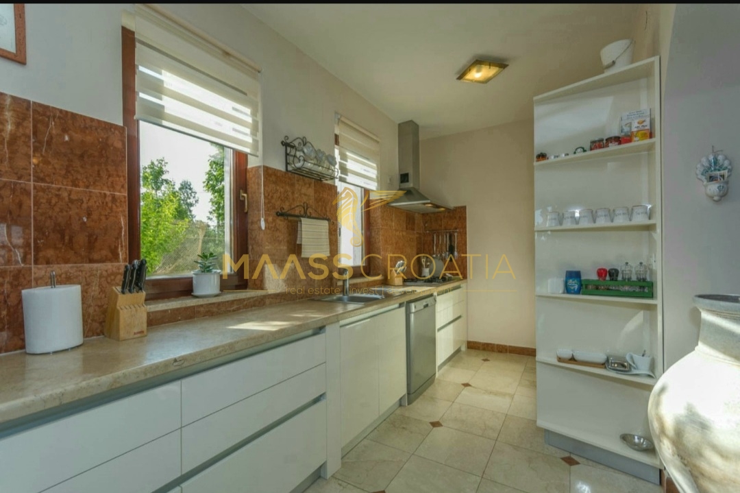Na parterze znajduje się również otwarta, w pełni wyposażona, nowoczesna kuchnia, dwie jadalnie z dopasowanymi meblami, kolejny salon z sofami, toaleta dla gości oraz sypialnia z nowoczesną łazienką. W tej części willi znajduje się również sąsiedni pokój. Masywne kamienne schody łączą parter z parterem. gdzie znajdują się 2 sypialnie z podwójnymi łóżkami, dwie łazienki i taras z niepowtarzalnym widokiem na cały ogród i bogatą zawartość tego eleganckiego i pełnego wdzięku arcydzieła. Wyjście z parteru rezydencji prowadzi na piękne patio, na którym znajduje się oryginalnie pomyślana i zaprojektowana zadaszona letnia hacjenda, meble wypoczynkowe i grill. Przestrzeń ta jest idealna do spotkań towarzyskich i relaksu w dobrym towarzystwie i pierwszorzędnej ofercie gastronomicznej, z której region Istrii jest powszechnie znany. Nieruchomość posiada również domek gościnny o powierzchni 50 m² z salonem na otwartym planie, kuchnią, sypialnią i łazienką.