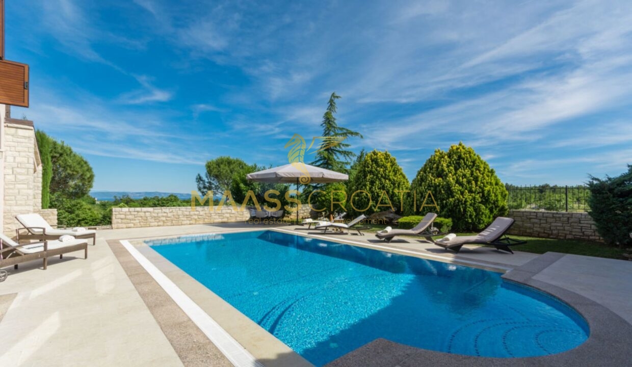 Do nieruchomości prowadzą kamienne schody, które prowadzą na przestronny parter rezydencji. W tej części znajduje się salon wyposażony w wygodne siedzenia, piękny kominek i nowoczesną technologię. Cała strona salonu jest pokryta szklaną ścianą, która rozciąga się na całej powierzchni ściany i oferuje niesamowity widok na piękny krajobraz, wyspę Cres, Lošinj i całą zatokę Kvarner. .