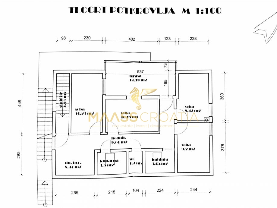 Das Dachgeschoß , mit der dritten Wohneinheit verteilt sich auf ein Wohnzimmer, Küche, vier Schlafzimmer, Bad , WC.