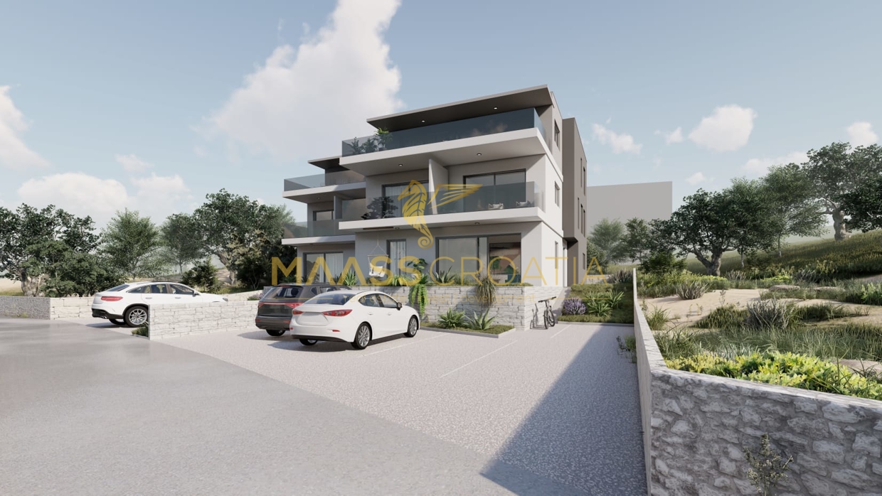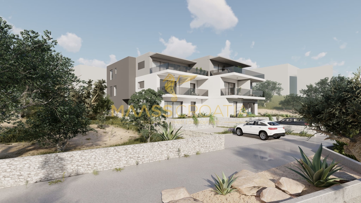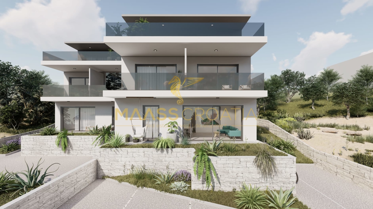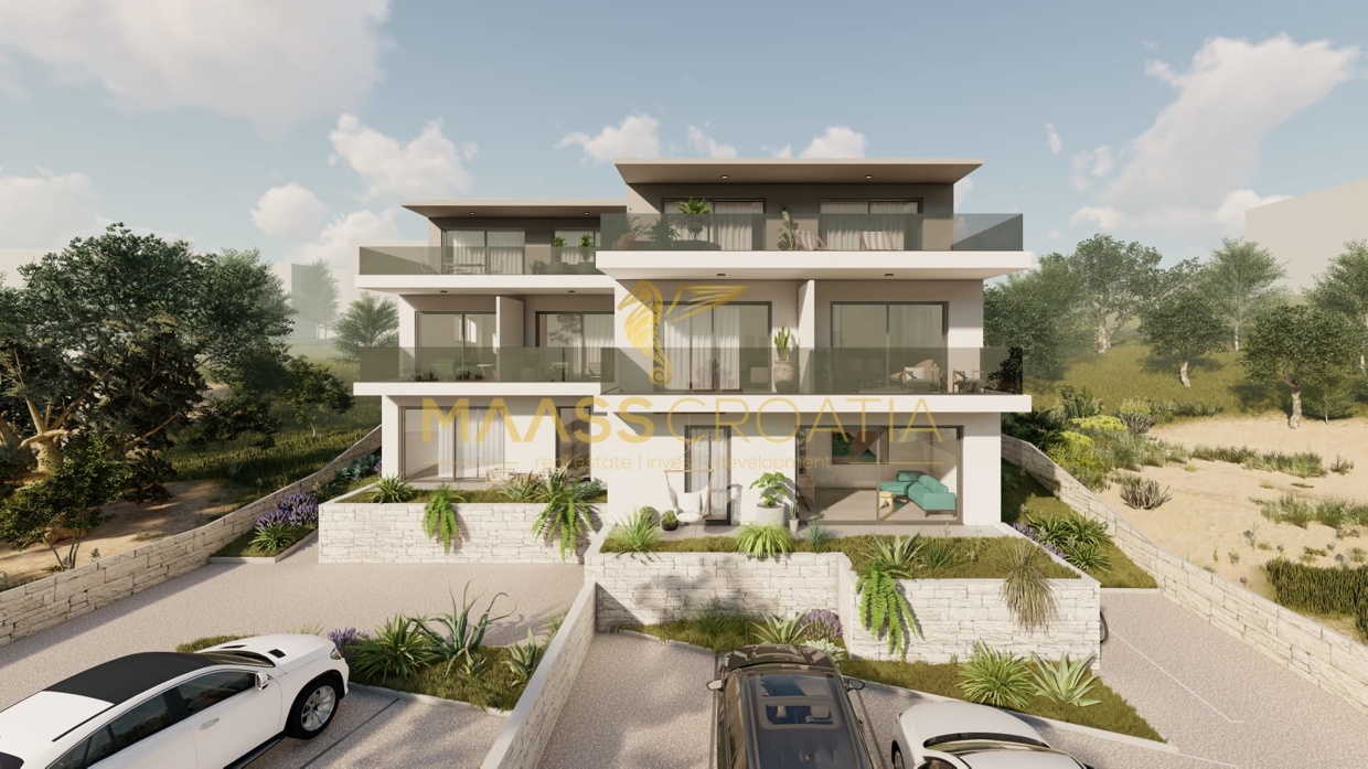 Dwa nowo wybudowane mieszkania na parterze z dużym ogrodem w pierwszym rzędzie do morza w pobliżu Sibenika